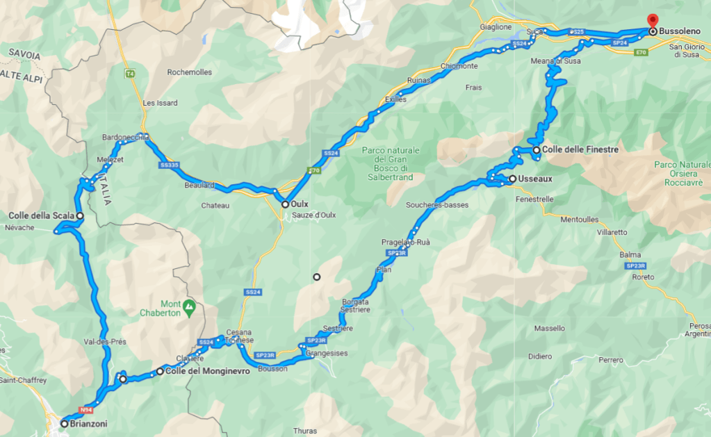| Percorso | Chianocco – Bardonecchia – Valle Stretta – Colle della Scala – Colle del Monginevro – Sestriere – Fenestrelle – Forte di Fenestrelle – Colle delle Finestre – Chianocco |