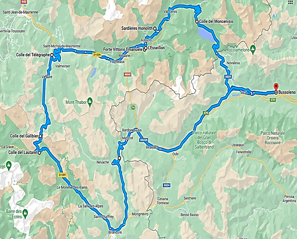 | Percorso | Chianocco – Colle del Moncenisio – Sardieres – Modane – Col du Telegraphe – Col du Galibier – Col du Lautaret – Briancon – Colle della Scala – Chianocco |