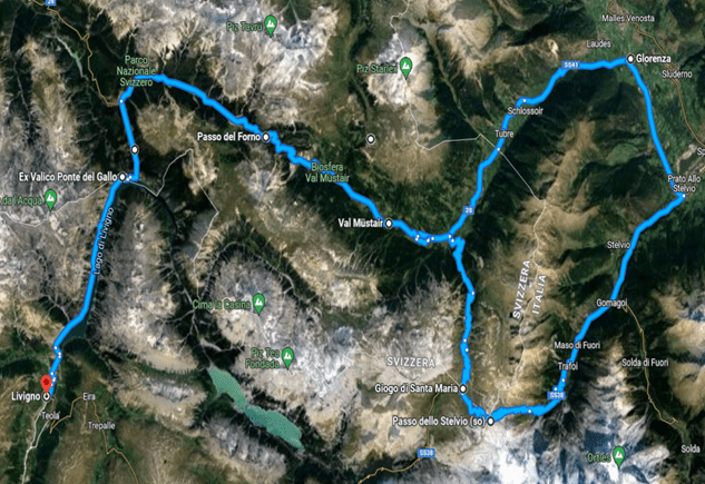 | Percorso | Livigno – Tunnel Munt La Schera – Passo del Forno – Glorenza – Prato allo Stelvio – Passo dello Stelvio – Giogo di Santa Maria (Umbrailpass) – Valmustair – Livigno |