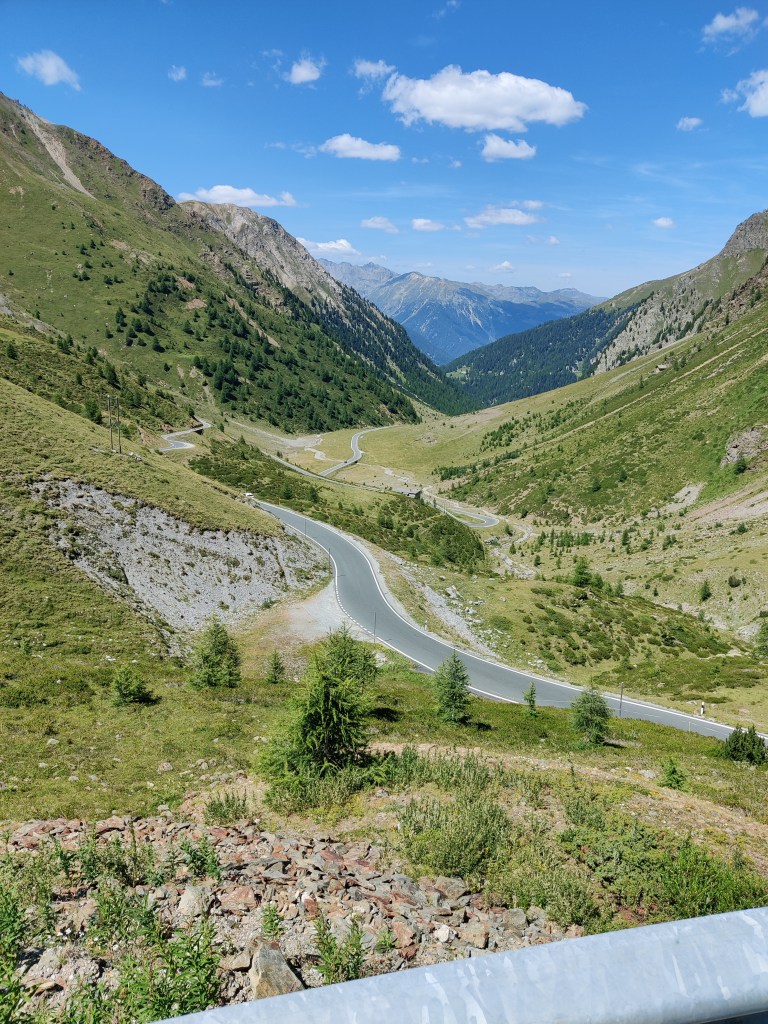 Tornati al Passo e inforcata la moto si scende in direzione Bormio. Pochi chilometri a valle si devia a destra e si imbocca la strada per il Passo Giogo di Santa Maria (Umbrailpass).