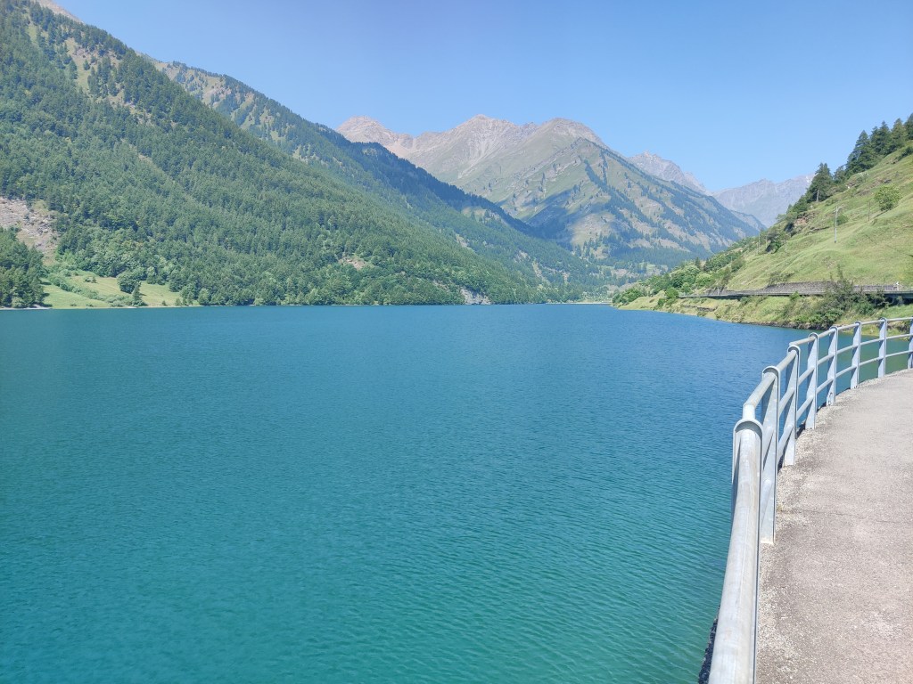 La discesa a Valle verso Sampeyre è più tortuosa del lato francese e molto più ripida. Il piacere di questo tratto però sta nel panorama che si gode da questa carreggiata a volte intagliata nella roccia e sempre a strapiombo sulla valle. Arrivati a Pontechianale ci si può fermare un istante al lago artificiale detto “di Castello” che sbarra il torrente Varaita e offre un bel colpo d’occhio.