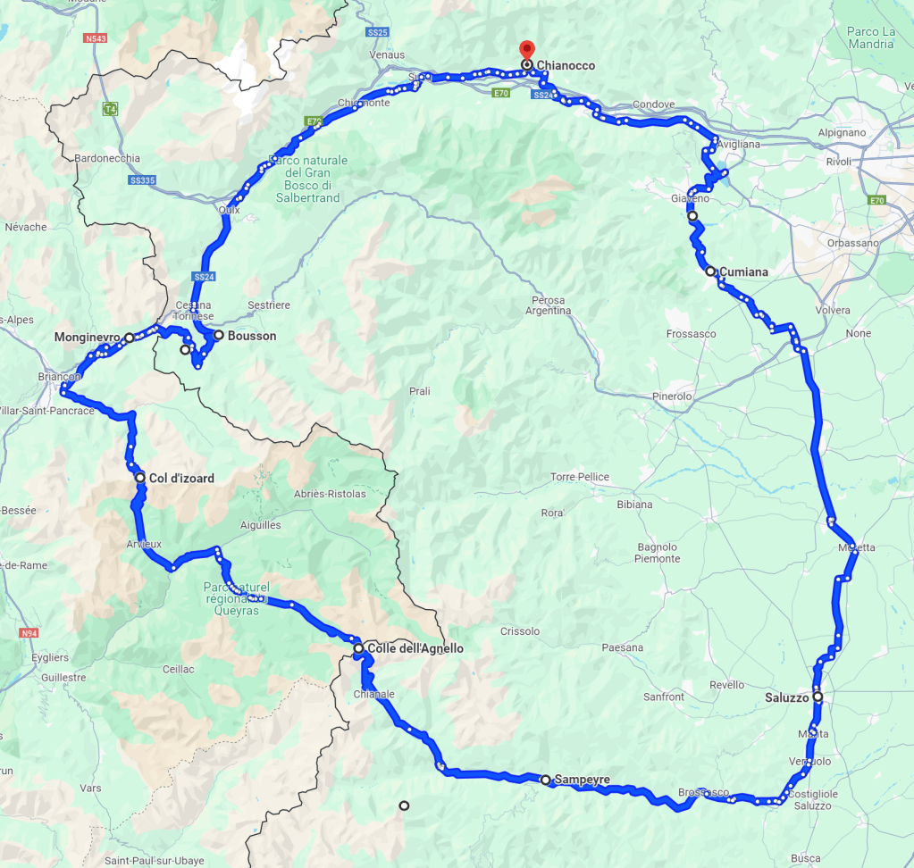 | Percorso | Chianocco – Bousson – Cesana Torinese – Colle Bercia – Colle del Monginevro – Briancon – Arvieux – Colle dell’Izoard – Molines en Queiras – Colle dell’Agnello – Sampeyre – Saluzzo – Colletta di Cumiana – Chianocco |
