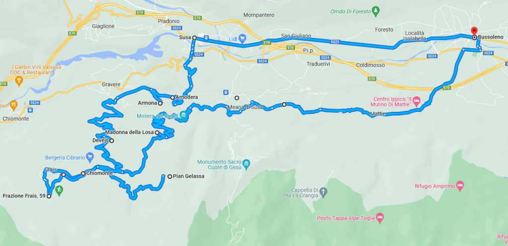 | Percorso | Chianocco – Mattie – Meana – Frais – Strada Assietta – Pian Gelassa – Devejs – Gravere – Armona – Arnodera – Susa – Chianocco |
