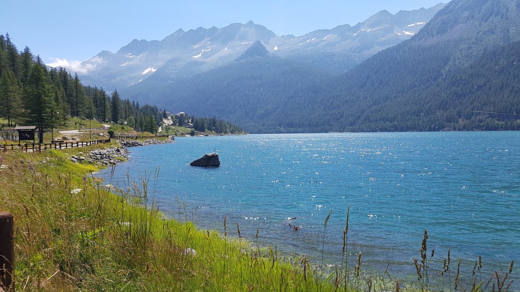 Lasciata Ceresole Reale si sale verso i Laghi Serrù e Angel su una tortuosa ma ben asfaltata strada in uno scenario alpino favoloso.