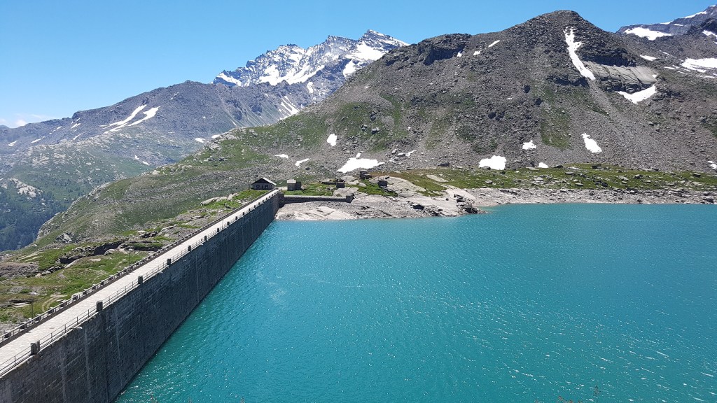 Una volta superata la diga del Serrù parcheggiate la moto poco oltre il secondo tornante in una piazzola sulla sinistra e da lì iniziate una passeggiata sul sentiero che si innalza su di una costa erbosa e che costeggia la sponda del bacino artificiale. E’ un percorso di poche decine di minuti ma il panorama da gustare non ha prezzo!