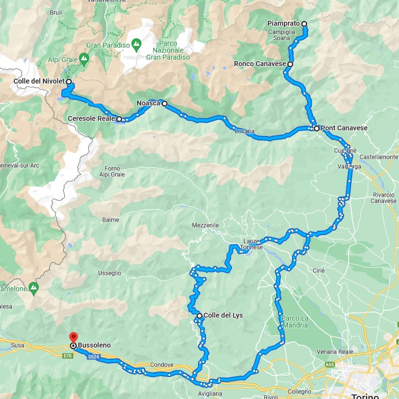 | Percorso | Chianocco – Colle del Lys – Lanzo – Pont Canavese – Noasca – Ceresole Reale – Colle del Nivolet – Pont Canavese – Ronco Canavese – Piamprato – La Cassa – Chianocco |