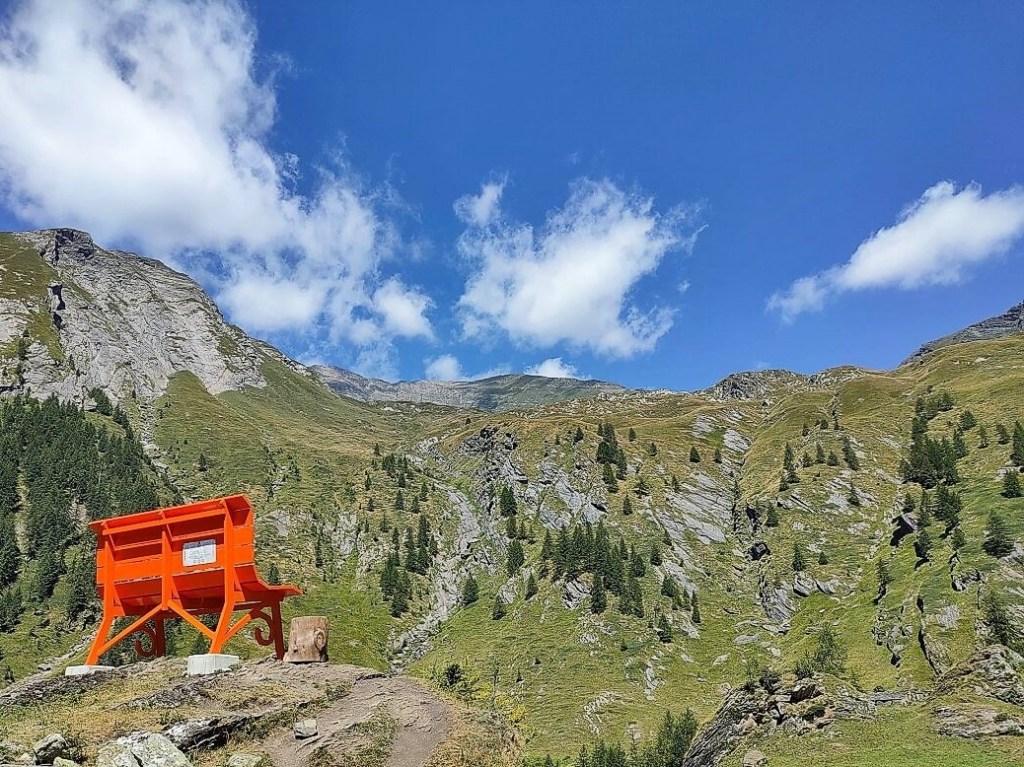 la maxi panchina arancione, è collocata a Piamprato Soana, a 1700 metri di quota, in un bel sito panoramico da cui si può ammirare tutta la valle. Usufruendo della Seggiovia Piamprato – Ciavanassa si può salire fino a quota 1874 m. dove vi è un ottimo punto ristoro, il Rifugio Rosa dei Banchi e dove, con un piccolo sforzo, si può scendere fino alla panchina con minor fatica.
