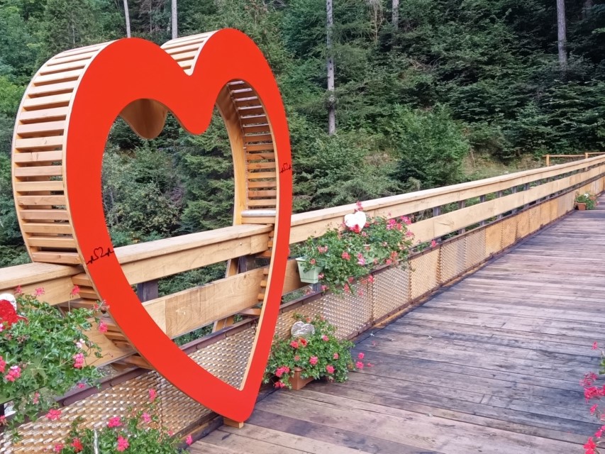 Rientrando possiamo effettuare una deviazione per visitare la Val Soana. Ronco è il centro di maggiore rilevanza della Valle. Come in altre vallate simili, alla fine della seconda guerra mondiale, molte donne abbandonarono i paesi di montagna per seguire i mariti all’estero o per recarsi nelle città dove gli uomini trovavano lavoro nelle fabbriche e cosi iniziò lo spopolamento. Oggi la maggior fonte di sopravvivenza è sita nel turismo. Nel 2021 è stato inaugurato il nuovo ponte (il vecchio fu distrutto nel 2018) e battezzato “ponte degli innamorati” il cui Cuore centrale permette foto panoramiche verso valle a chi lo desidera.