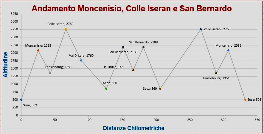 Il viaggio da La Thuile ripercorre i luoghi dell’andata in toto. Per meglio comprendere di che percorso si tratti ho inserito in un piccolo grafico i punti principali oggi visitati. Se si sommano le quote altimetriche delle varie località, considerando tutti i cambiamenti di altitudine, risulta che siamo saliti e scesi per un totale di 15374 m. Quindi attenzione prima di intraprendere questo tour