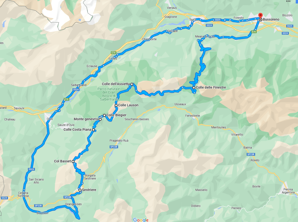 | Percorso | Chianocco – Meana di Susa – Colle delle Finestre – Pian dell’Alpe – Colle Assietta – Colle Lauson – Colle Blegier – Monte Genevris – Colle Testa Piana – Colle Bourget – Col Basset – Sestriere – Cesana – Oulx -Chianocco |