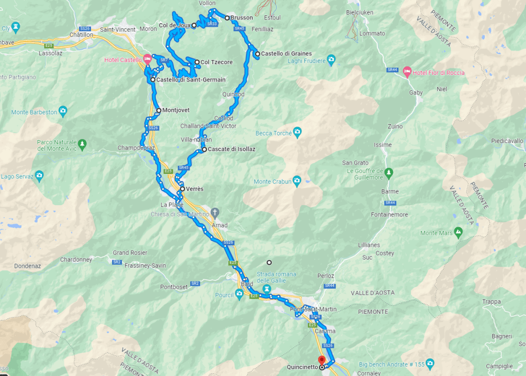 | Percorso | Chianocco – Quincinetto – Bard – Verrès – Cascate di Isollaz – Castello di Graines – Brusson – Col de Joux – Col Tzecore – Castello di Saint Germain – MontJovet – Arnad – Quincinetto – Chianocco |