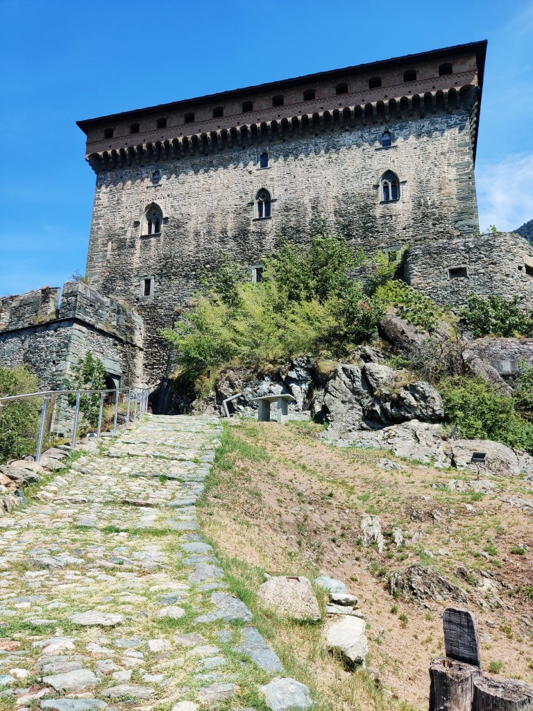 Il Castello di Verrès è uno dei più famosi manieri medievali valdostani. Costruito come fortezza militare dalla Famiglia Challant nel XIV secolo, fu uno dei primi esempi di castello monoblocco, costituito cioè da un unico edificio a differenza dei manieri più antichi formati da una serie di corpi di fabbrica racchiusi da una cinta muraria. Si erge su un promontorio roccioso che domina l’abitato del paese di Verrès e la strada della Val d’Ayas che andremo a percorrere a breve. Esternamente appare come un austero cubo di trenta metri di lato, praticamente privo di elementi decorativi. Entrati nel castello ci si ritrova in un androne quadrato ricoperto da una volta a sesto acuto, ulteriore elemento di difesa del castello. Su di esso si aprono infatti diverse feritoie ed una botola sul soffitto, dalle quali sarebbe stato possibile bersagliare eventuali invasori intrappolati all’interno con olio bollente o pece come era uso ai tempi.